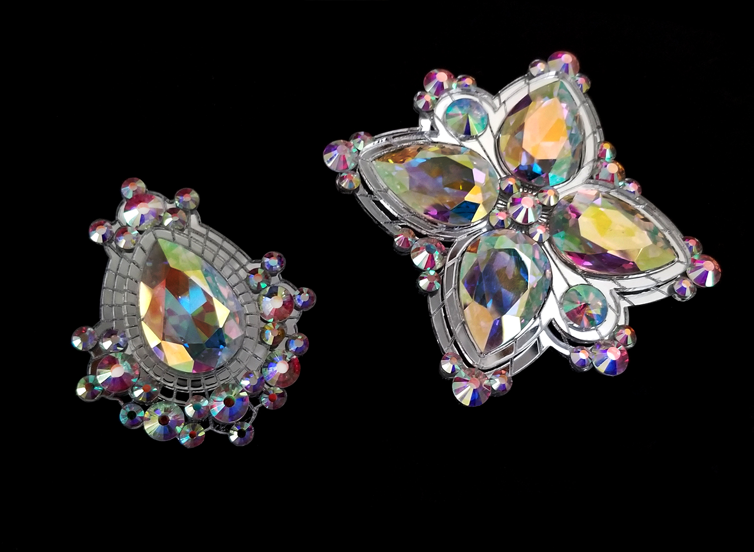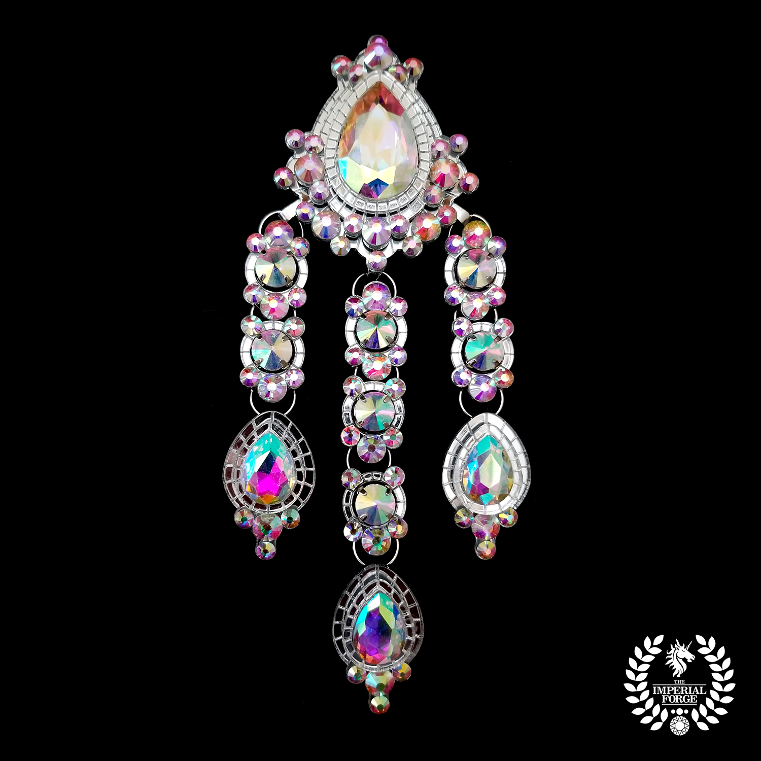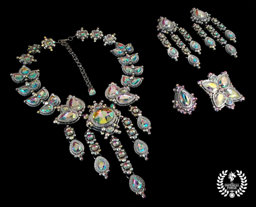 Custom JewelryAurora’s Reign A silver mirror set, comprising a necklace with laurel leaf design, earrings and two rings, set with AB crystals. Custom rhinestone chains may be detached from earrings and from the necklace. Earrings fall approx. 7” Light’s Guidance Vanguard of the Dark Diamond