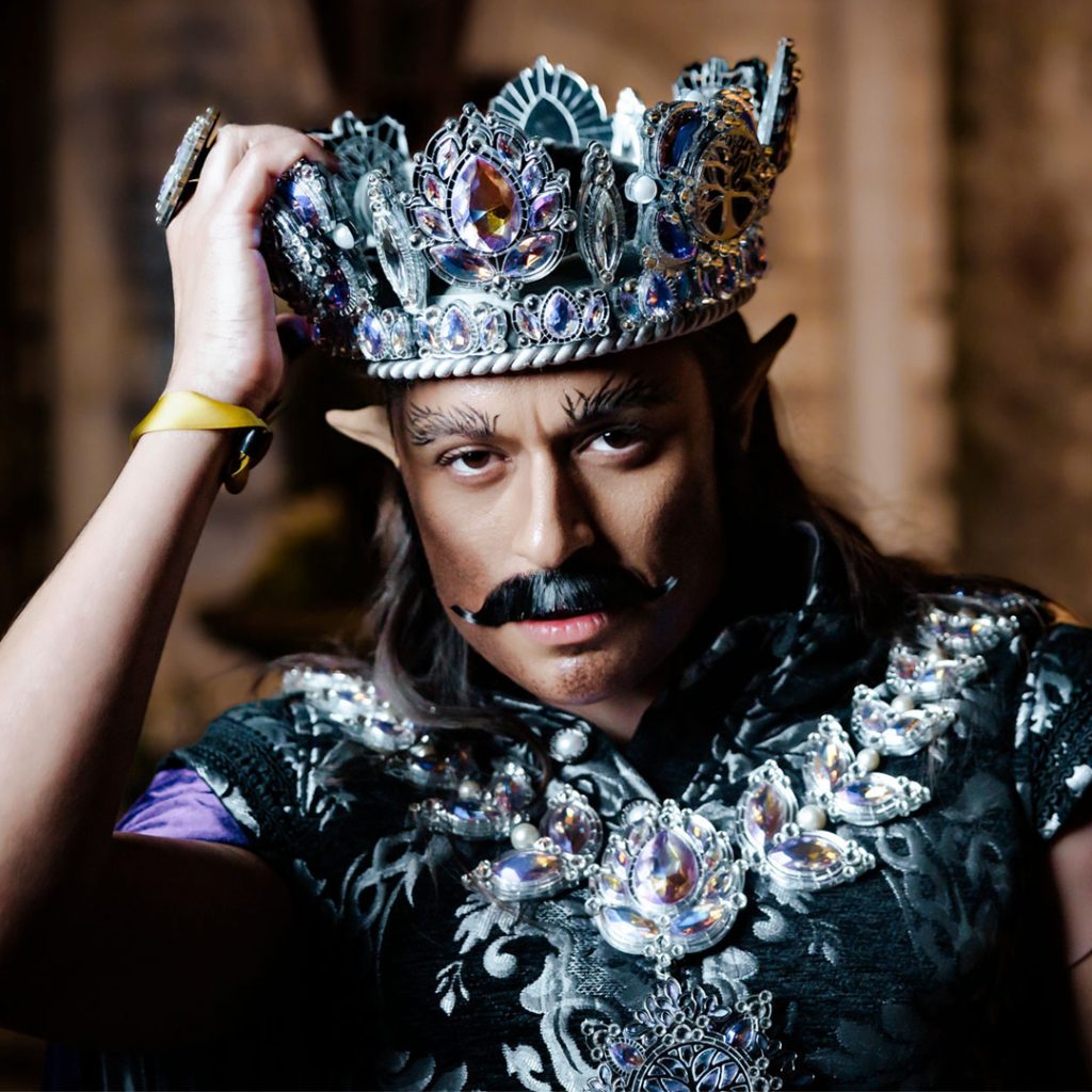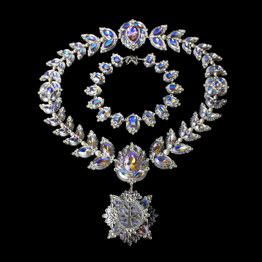 A silver mirror crown, mantle and pendant, created for The Tiny Minotaur Tavern’s Unseelie Silver Gala. The crown features violet AB and clear crystals, and includes a velvet cushion affixed to its inner ring for comfort. It is easily removed and is washable.
