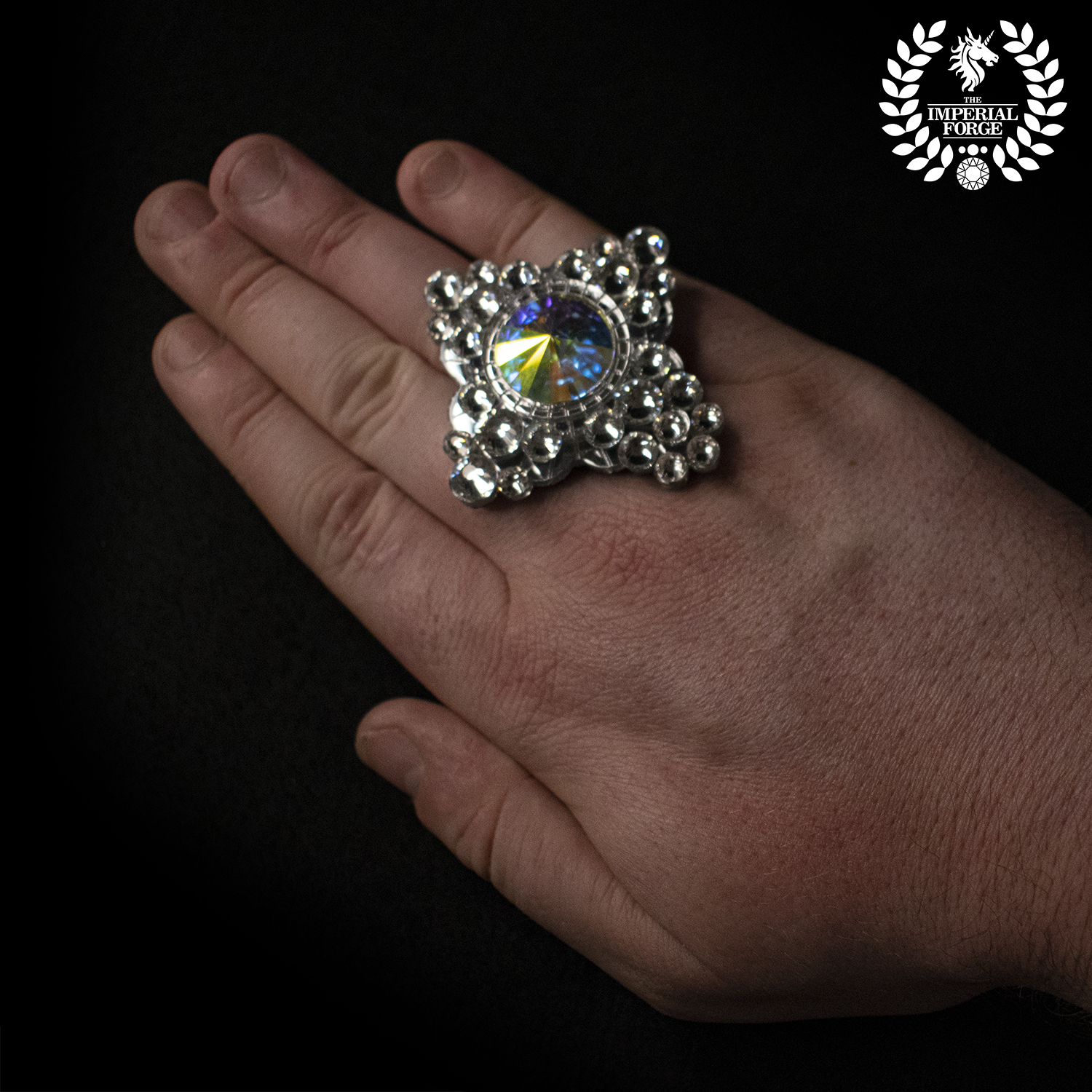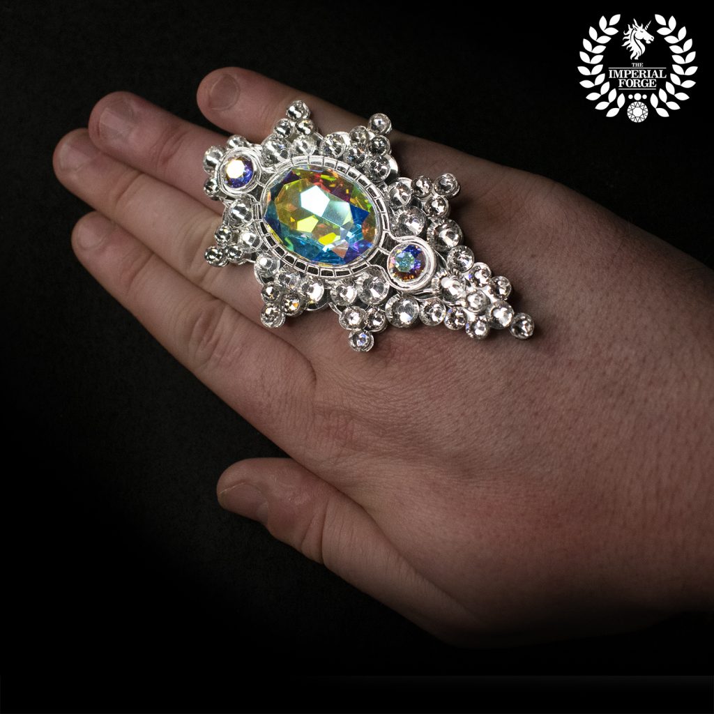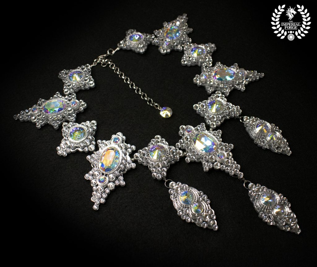 Both jaw-droppingly gorgeous and versatile, this necklace sports pendants that easily detach/reattach, allowing you to wear this high and tight or low and broad. Mesmerizing AB crystals are set in a silver mirror base, paved with clear stones.