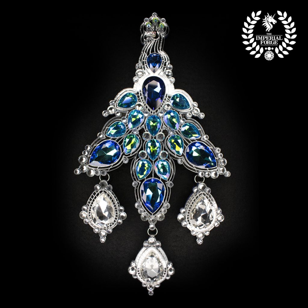 Casting a beady, bejeweled eye to its onlookers, this silver mirror peacock sits proudly on its perch. It drapes its stunning heliotrope and lake blue AB feathers downwards. At the end of each major feather dangles a clear teardrop. The entire piece is embellished with small clear stones.