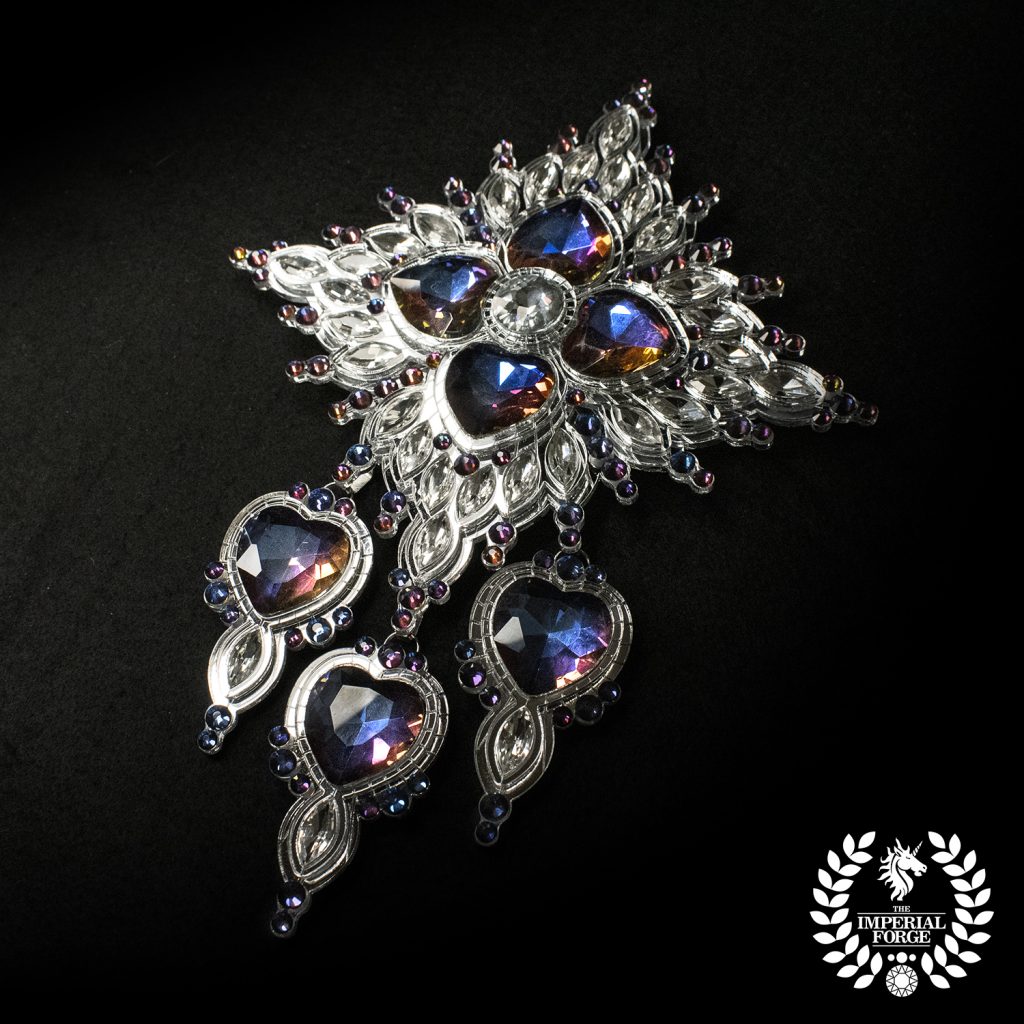 This huge silver brooch features a central clear crystal chaton surrounded by four outwardly-pointing hearts in volcano. This utterly gorgeous color effect shines hues of purples, oranges, reds and blues. Extending from the hearts are groups of small crystal navettes. The brooch is finished with dozens of smaller volcano crystals.
