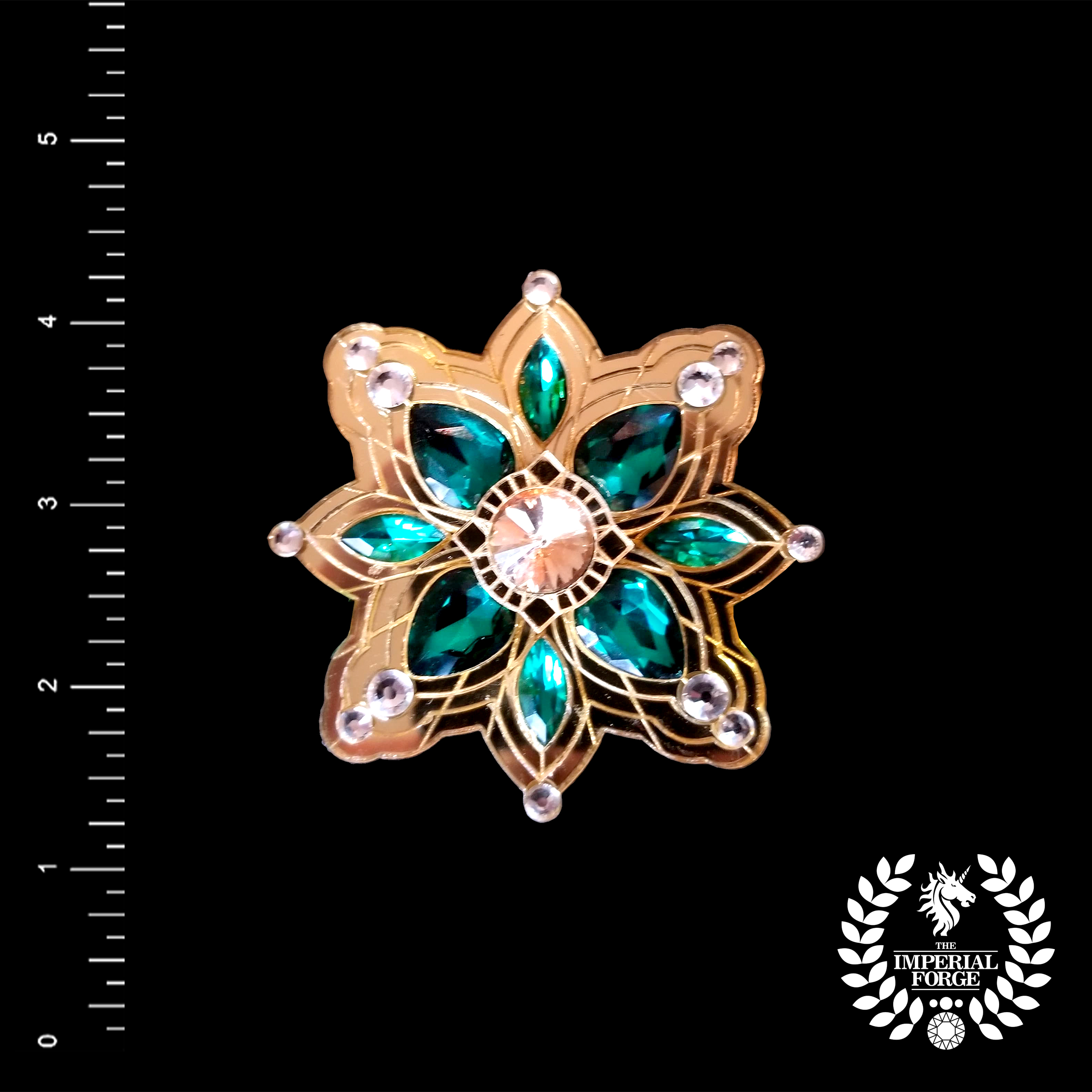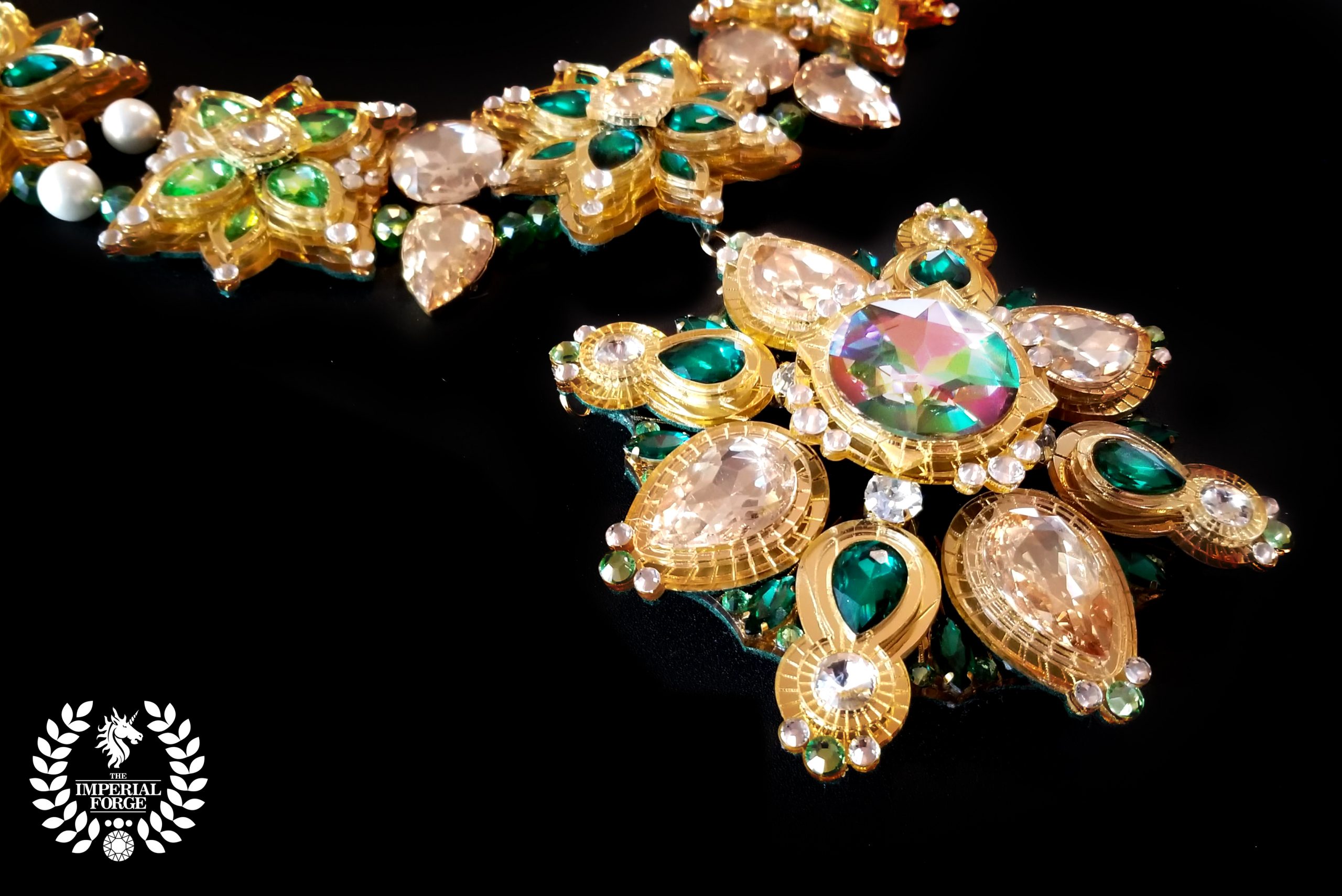 A large mantle in gold mirror, studded with emerald, peridot and champagne crystals and strung with glass pearls. The large pendant is detachable and may be worn as a brooch. The pendant has a discreet lobster clasp on its lower back, allowing a medallion to be hung from it.